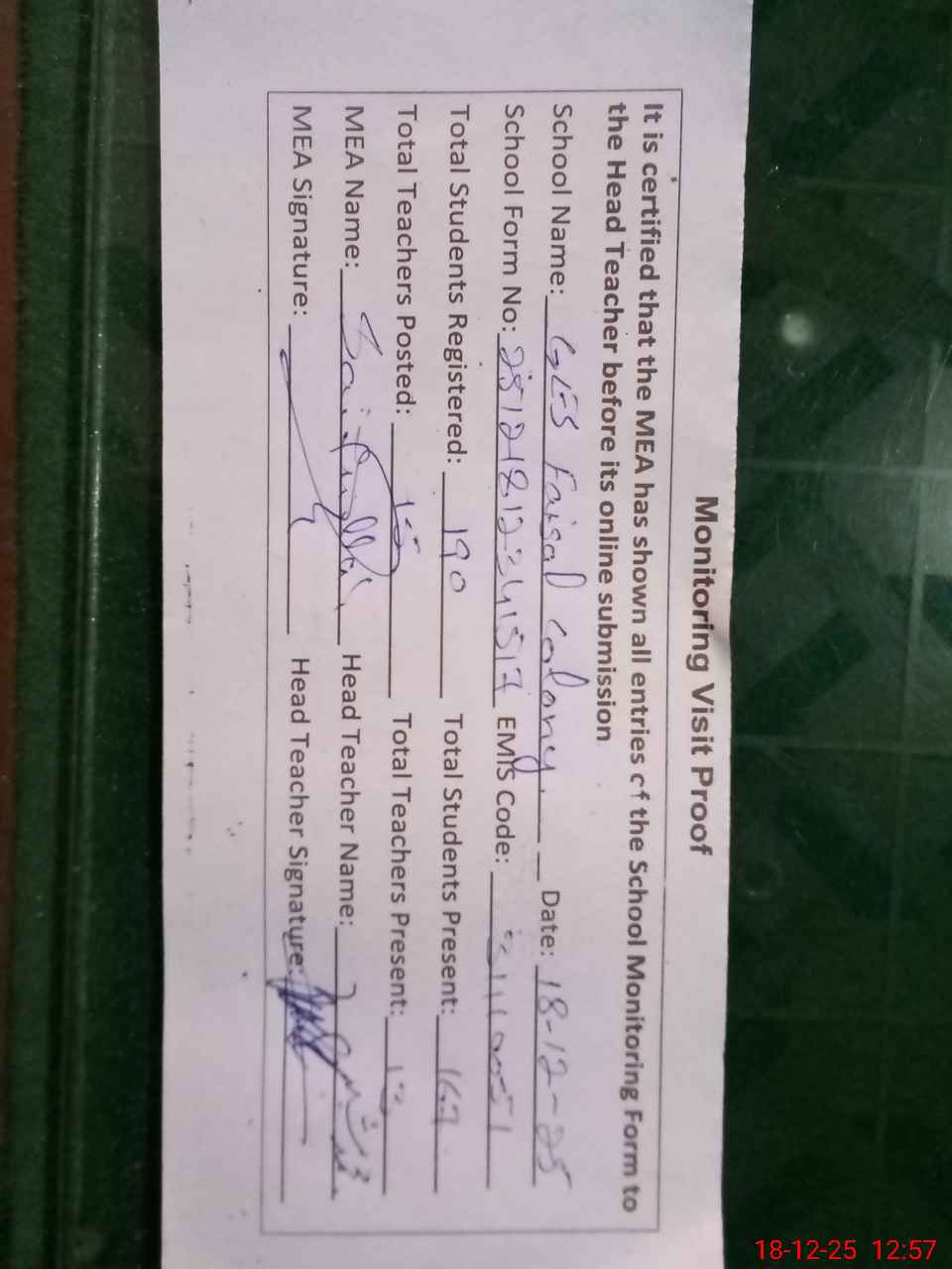| EMIS Code: 31110051 | Name of School: GES FAISAL COLONY | |||