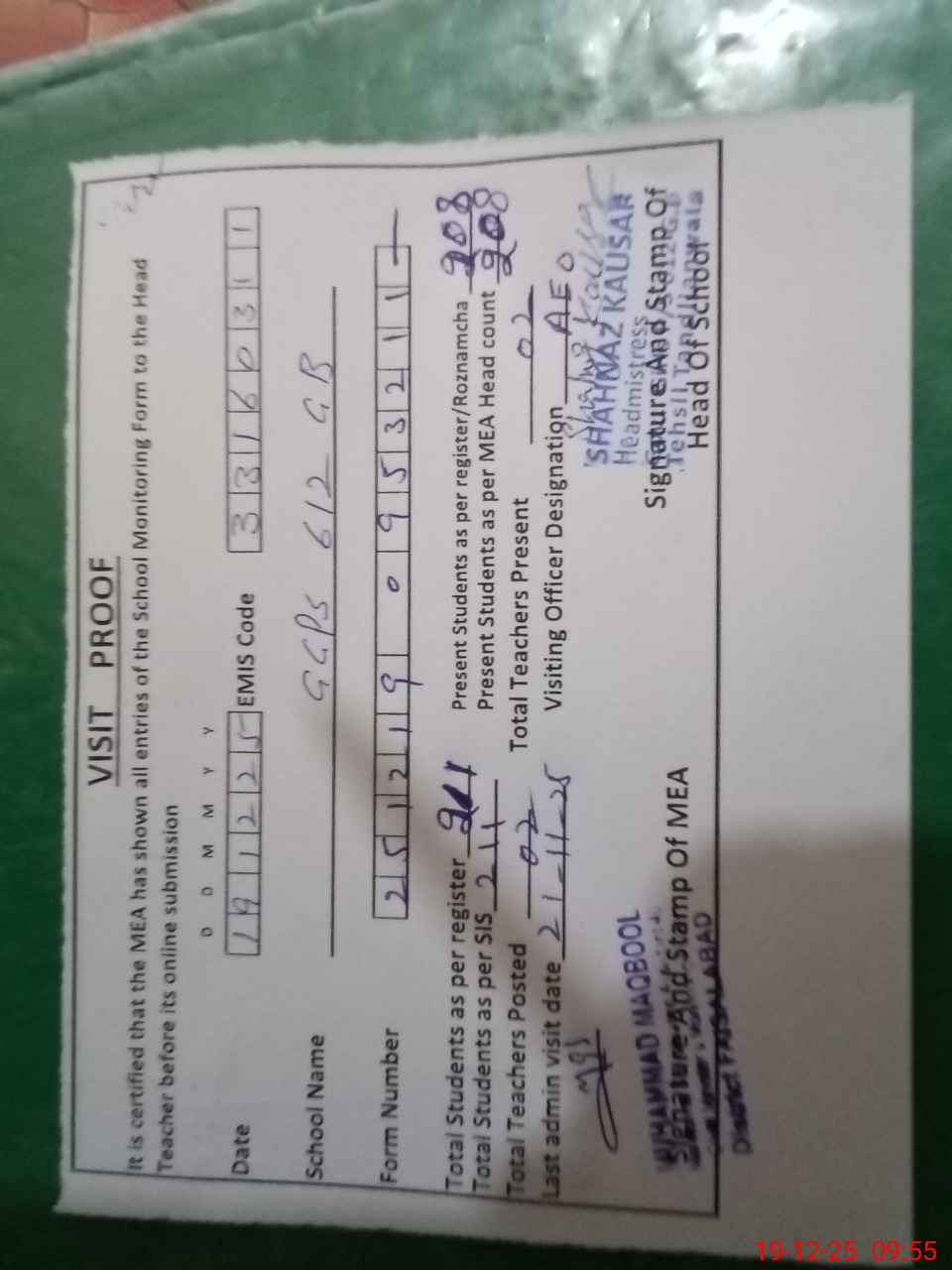 | Certified that this School was Inspected by the Undersigned MEA/DMO Today and the Information Stated Above is as Per Record. | |||||
