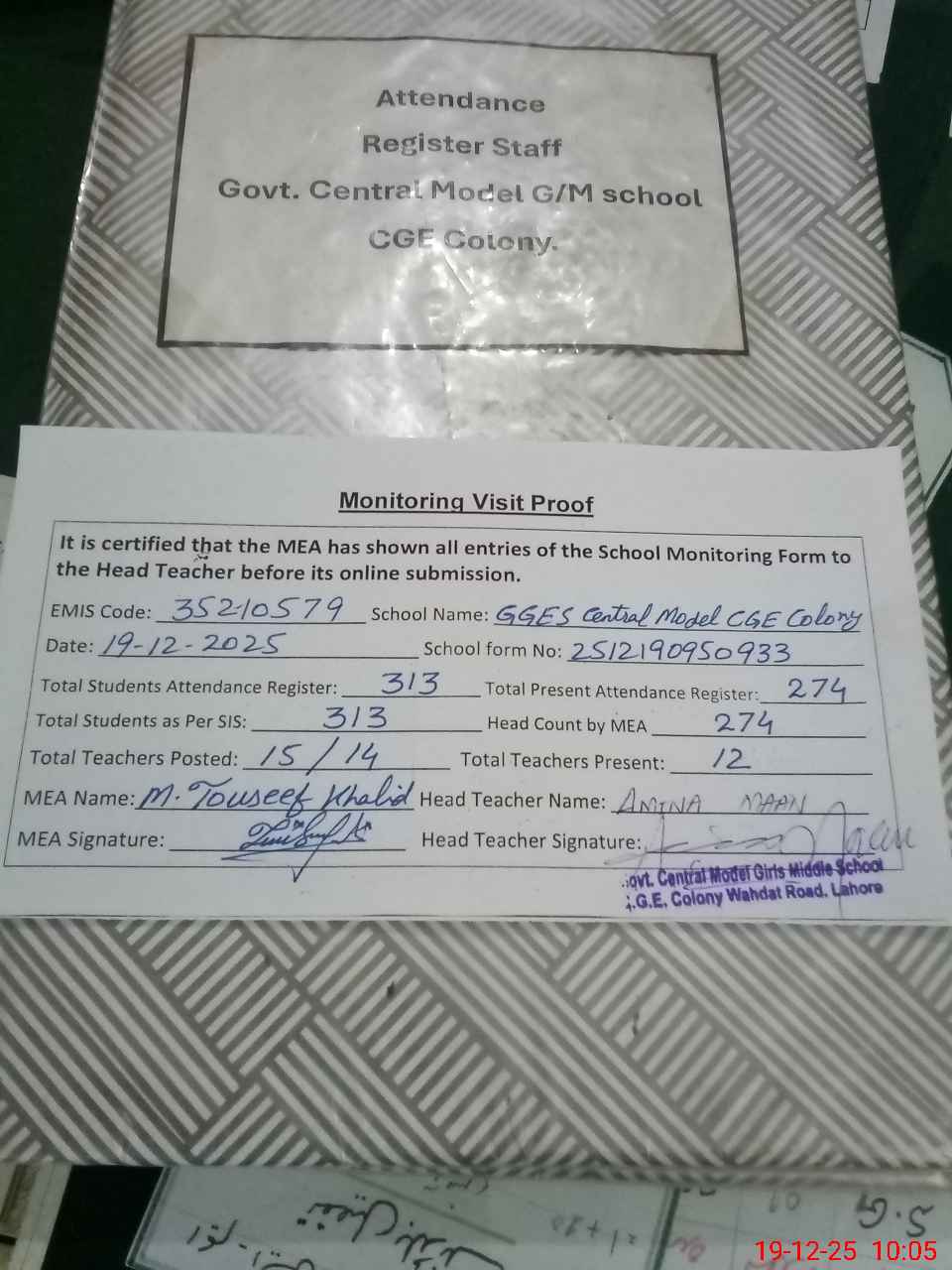 | Attendance Register | Head Teacher | MEA with School | Visit Proof |