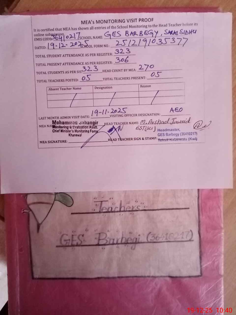 | Attendance Register | Head Teacher | MEA with School | Visit Proof |