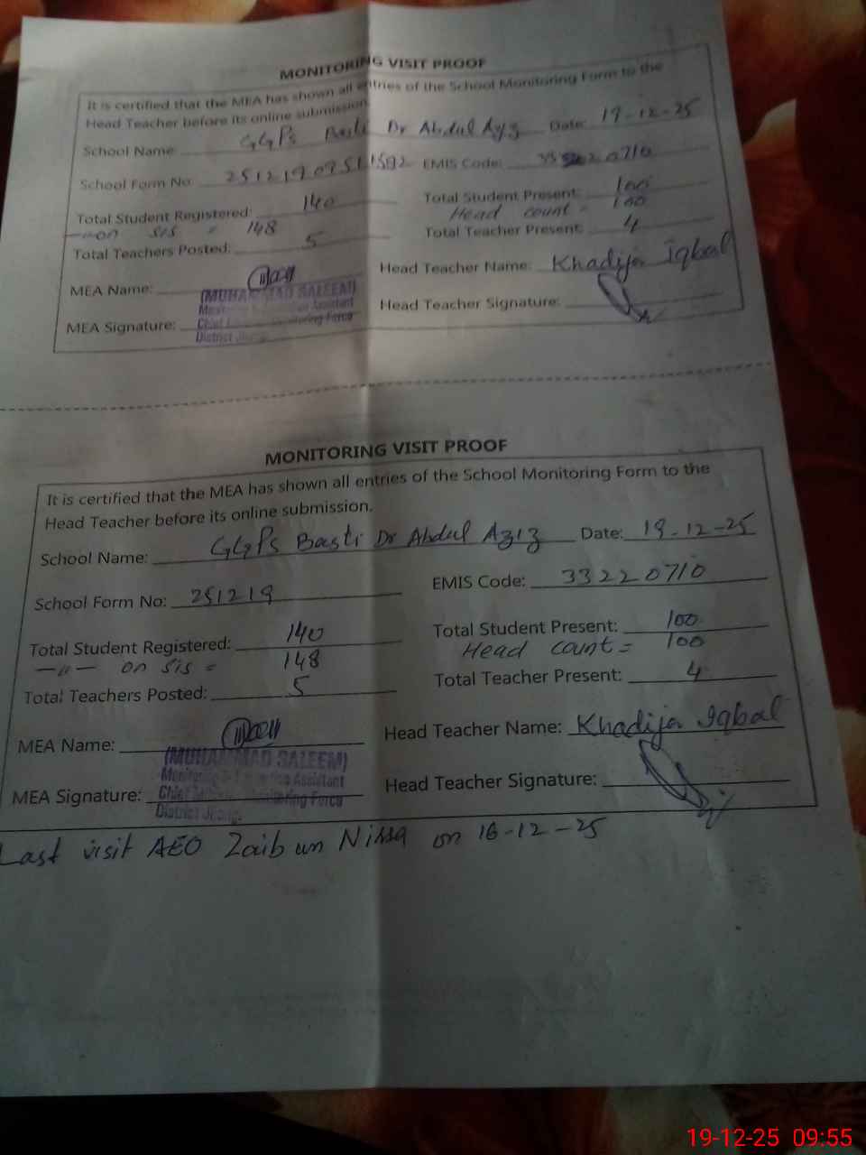 | Attendance Register | Head Teacher | MEA with School | Visit Proof |