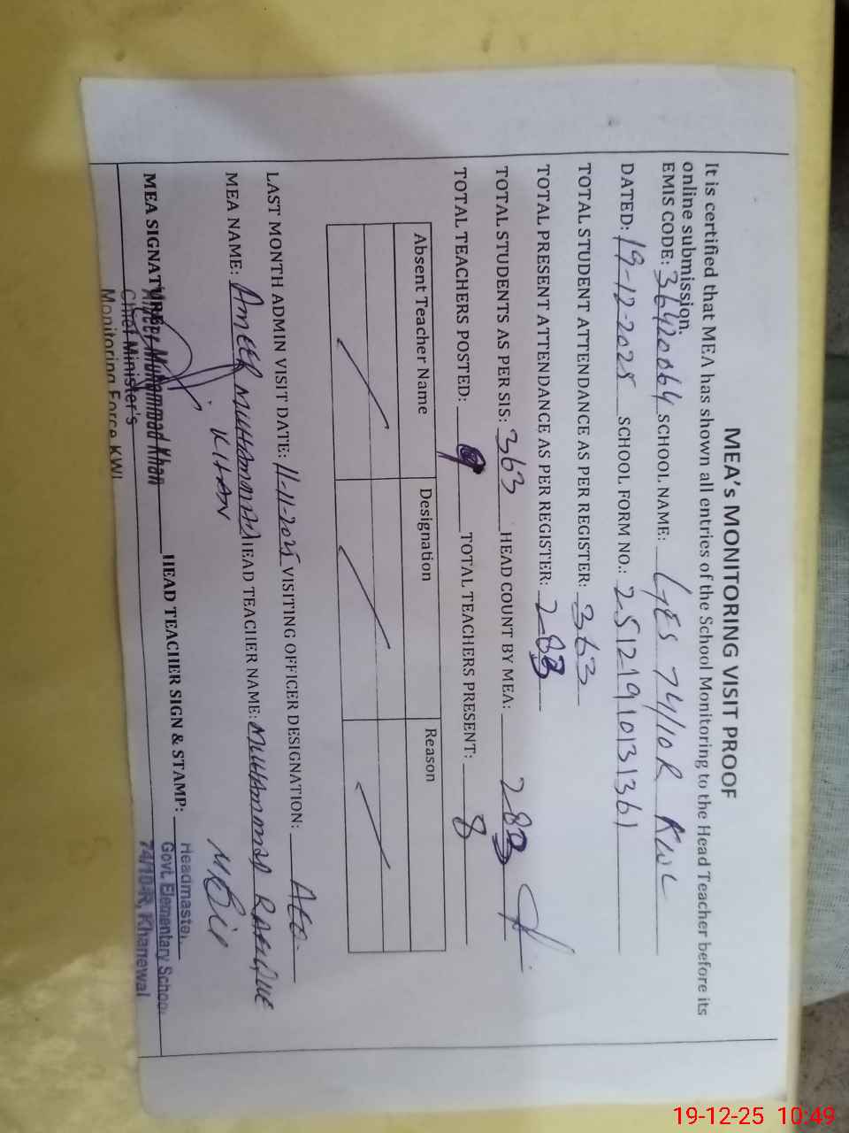 | EMIS Code: 36420064 | Name of School: GES 74/10-R, KHANEWAL | |||