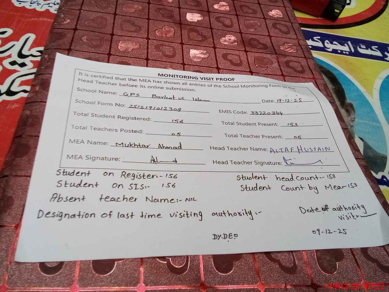 | Certified that this School was Inspected by the Undersigned MEA/DMO Today and the Information Stated Above is as Per Record. | |||||