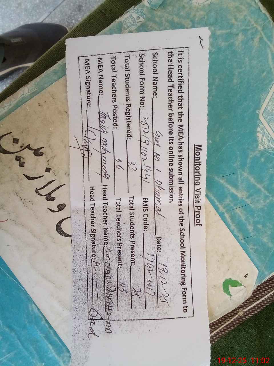 | Attendance Register | Head Teacher | MEA with School | Visit Proof |