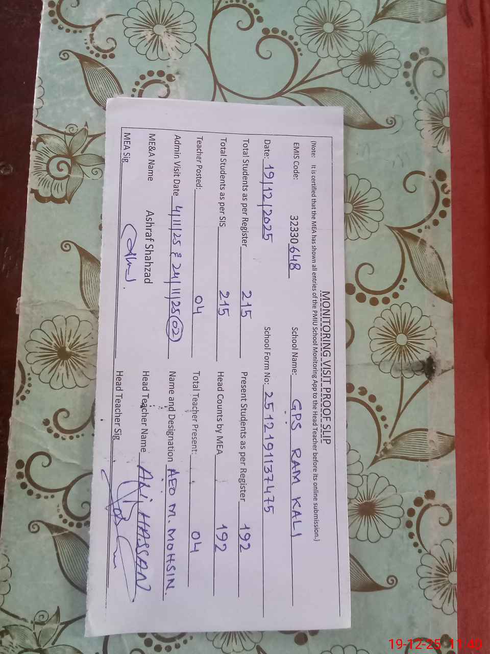 | Attendance Register | Head Teacher | MEA with School | Visit Proof |