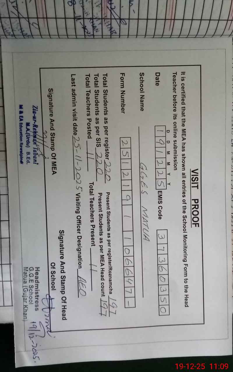 | Attendance Register | Head Teacher | MEA with School | Visit Proof |