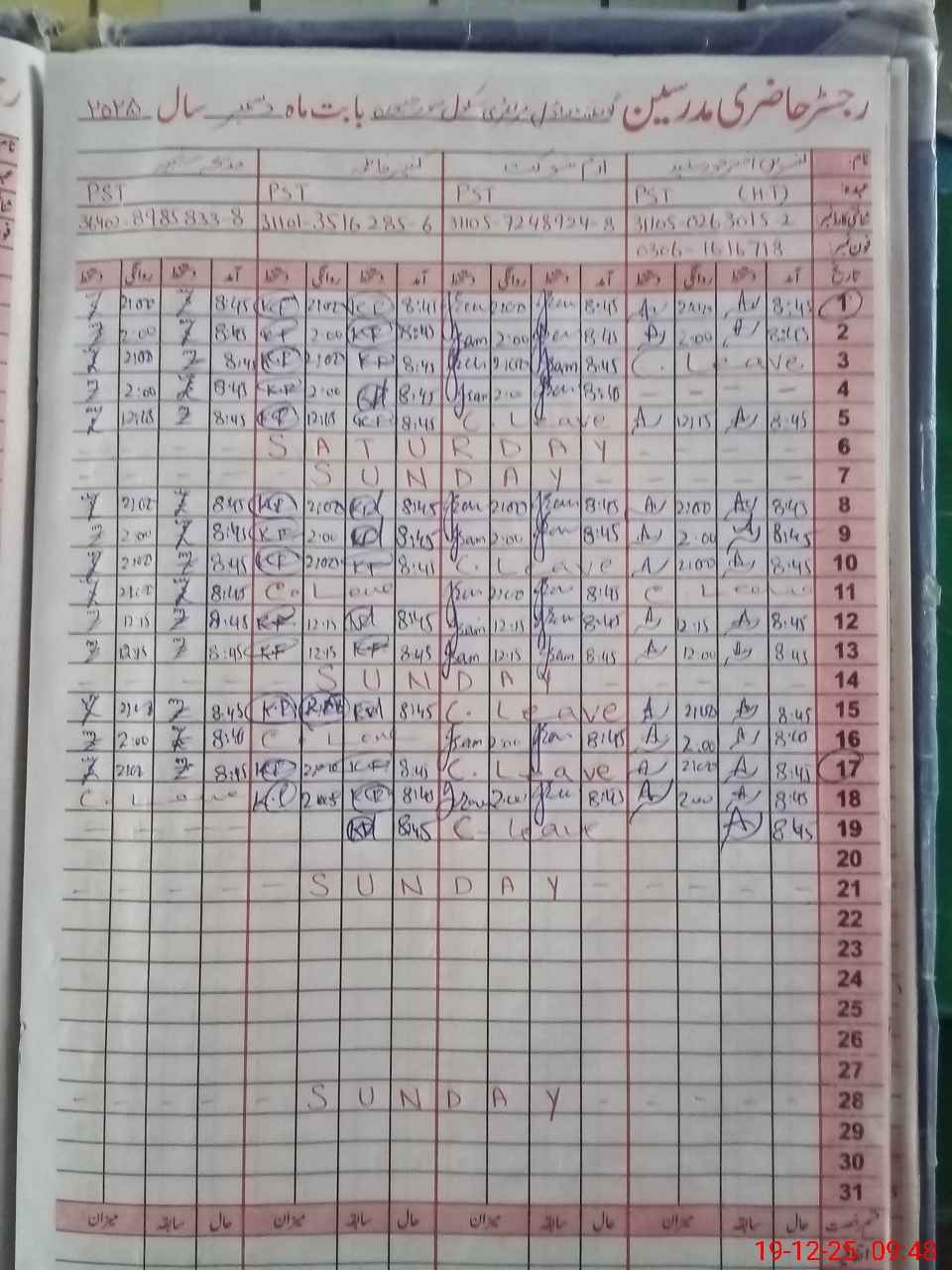 | CNIC | Full Name | Designation | R/C | Absence During Last Calender Month |