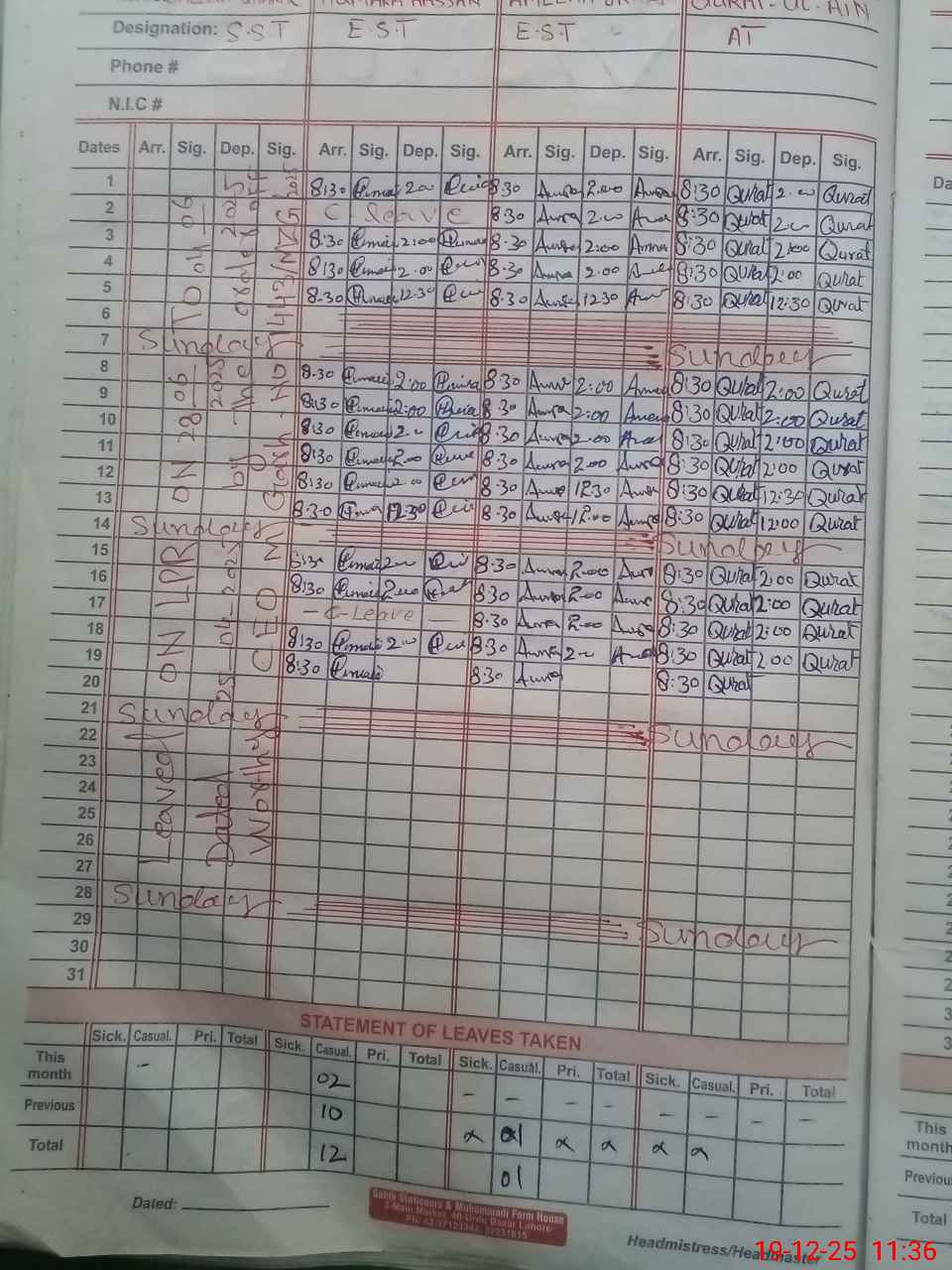 | CNIC | Full Name | Designation | R/C | Absence During Last Calender Month |