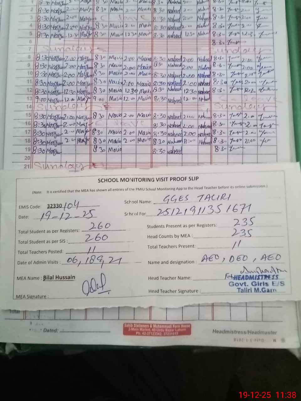 | Attendance Register | Head Teacher | MEA with School | Visit Proof |