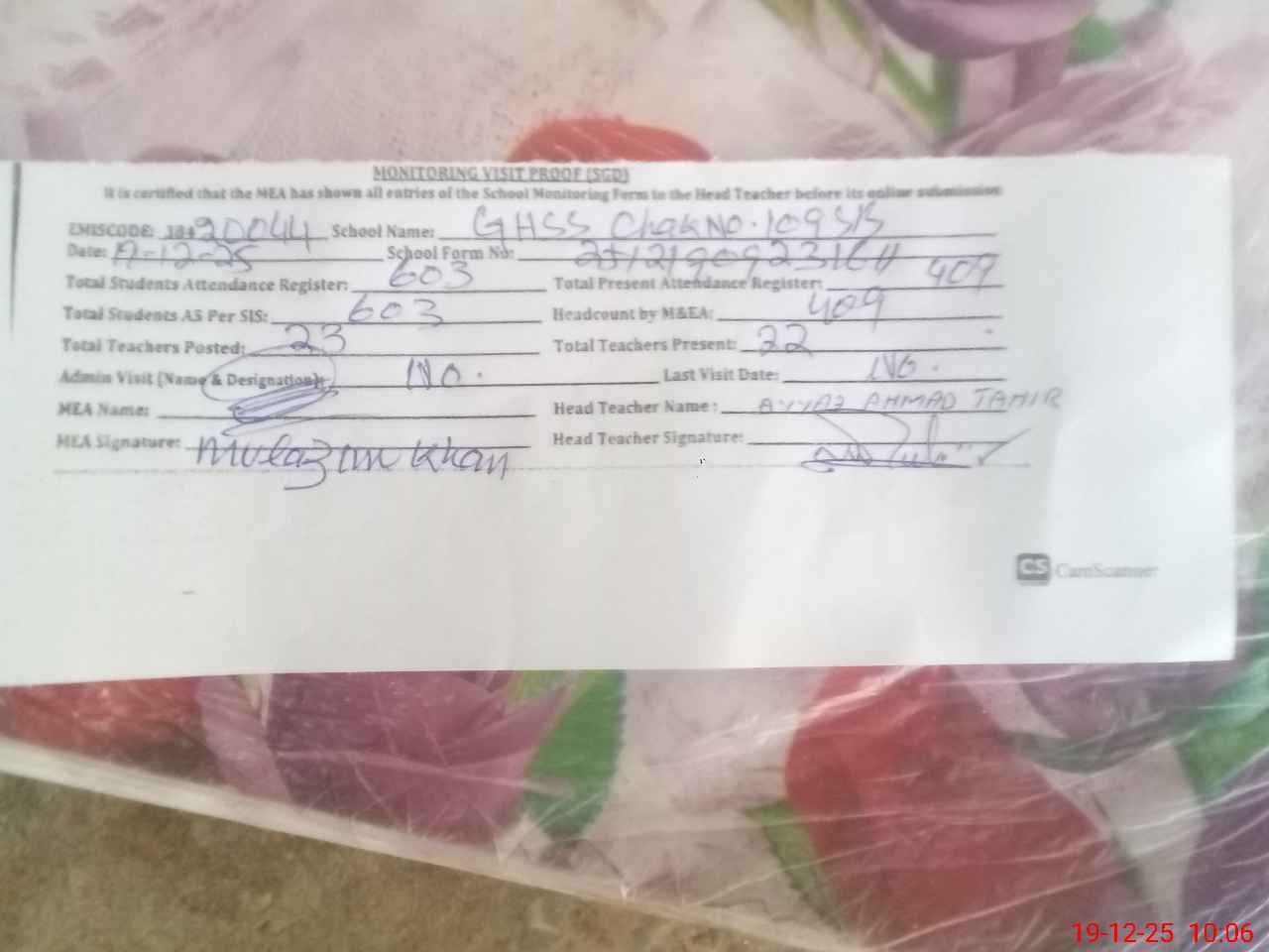 | EMIS Code: 38420044 | Name of School: GHSS CHAK NO.109 SB | |||