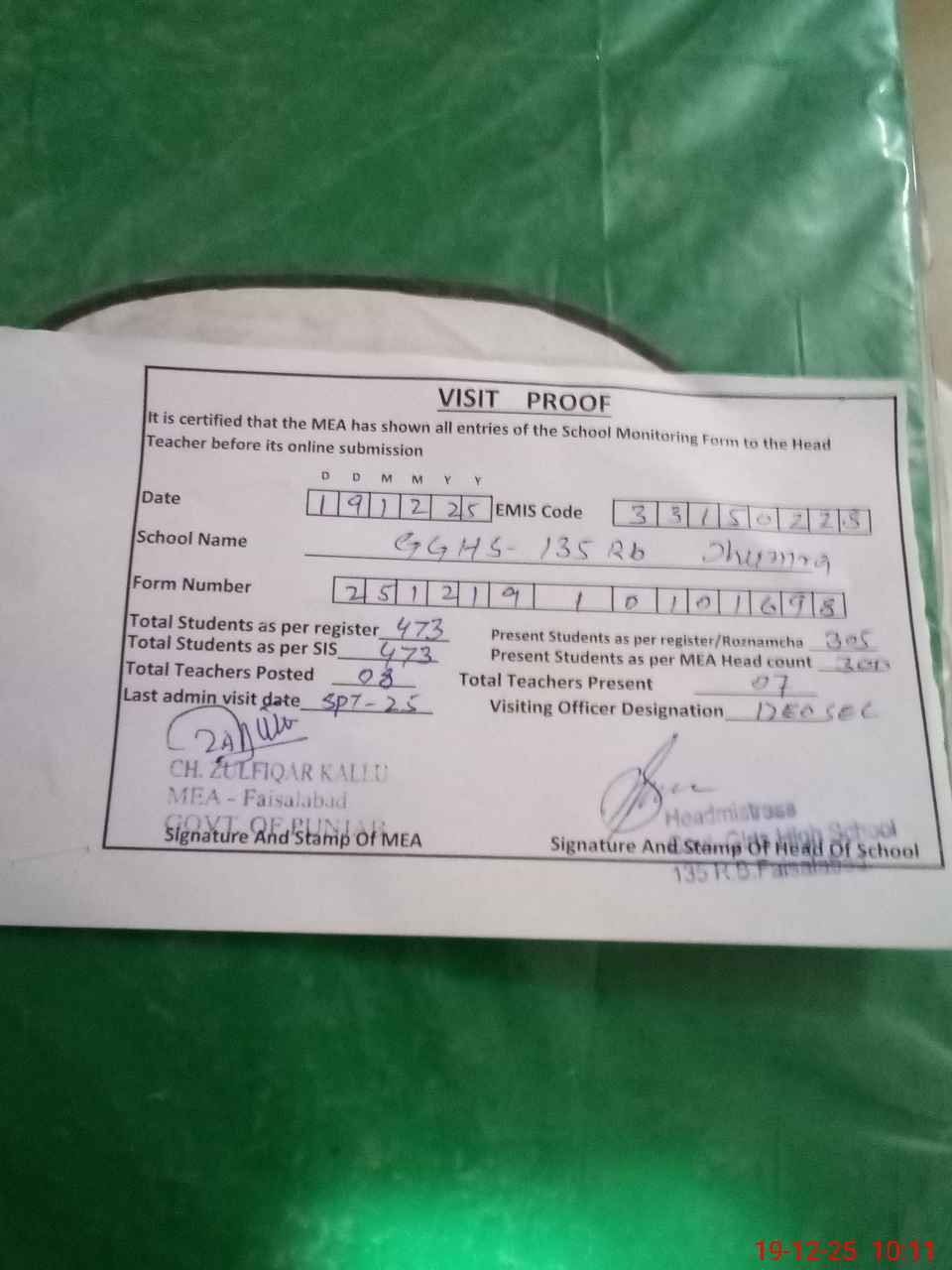 | EMIS Code: 33150228 | Name of School: GGHS CHAK 135 RB CHAK JHUMRA FSD | |||