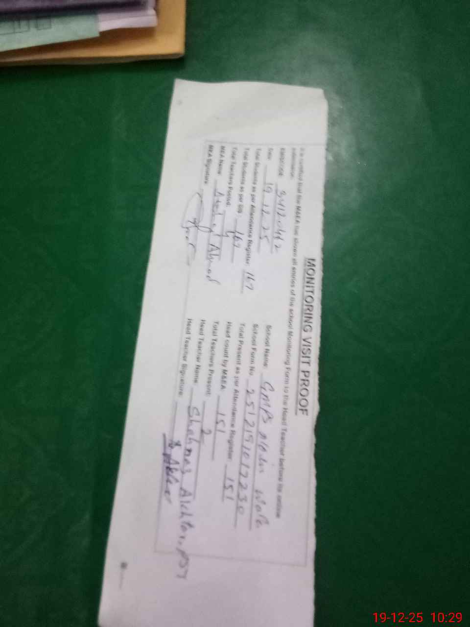 | Attendance Register | Head Teacher | MEA with School | Visit Proof |