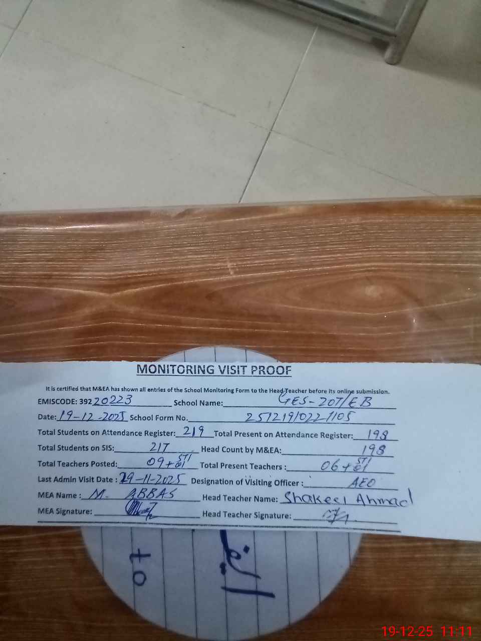 | EMIS Code: 39220223 | Name of School: GES CHAK NO. 207 EB P.O SAME ARIF WALA | |||