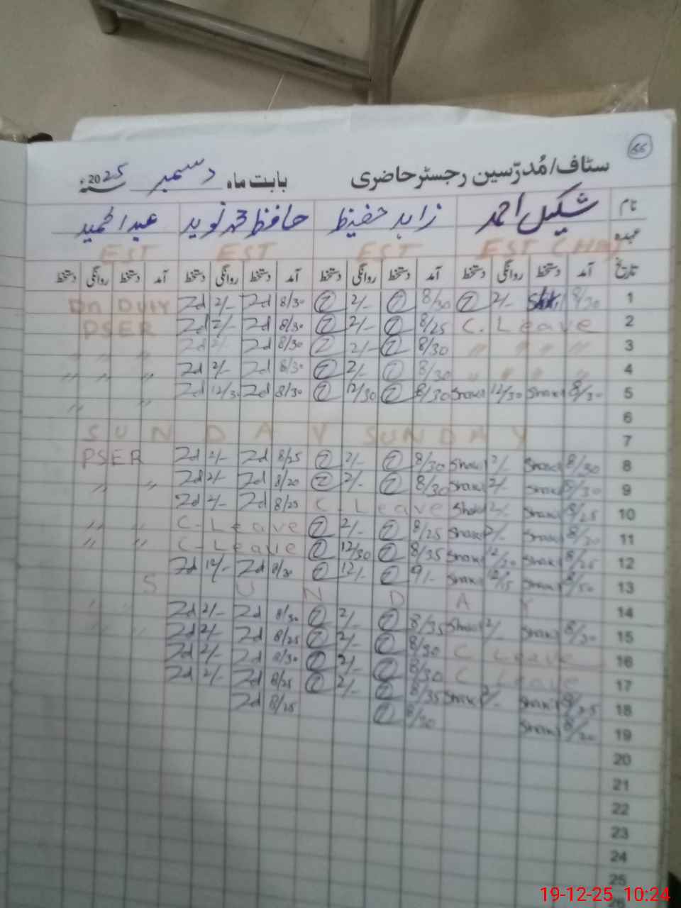 | CNIC | Full Name | Designation | R/C | Absence During Last Calender Month |