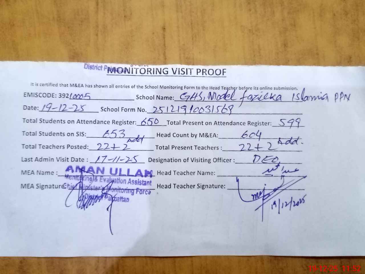 | Certified that this School was Inspected by the Undersigned MEA/DMO Today and the Information Stated Above is as Per Record. | |||||