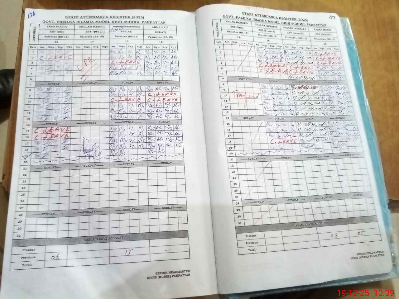 | CNIC | Full Name | Designation | R/C | Absence during last cal. month |