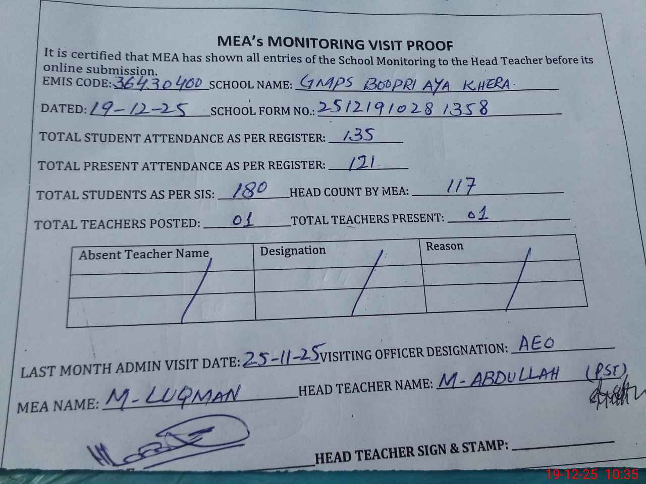 | EMIS Code: 36430400 | Name of School: GMPS BOOPRI AYA KHERA, TULAMBA | |||