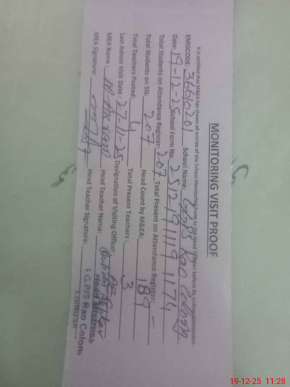 | Attendance Register | Head Teacher | MEA with School | Visit Proof |