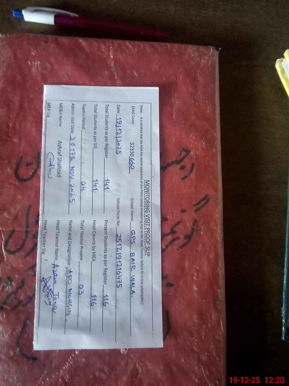 | Attendance Register | Head Teacher | MEA with School | Visit Proof |