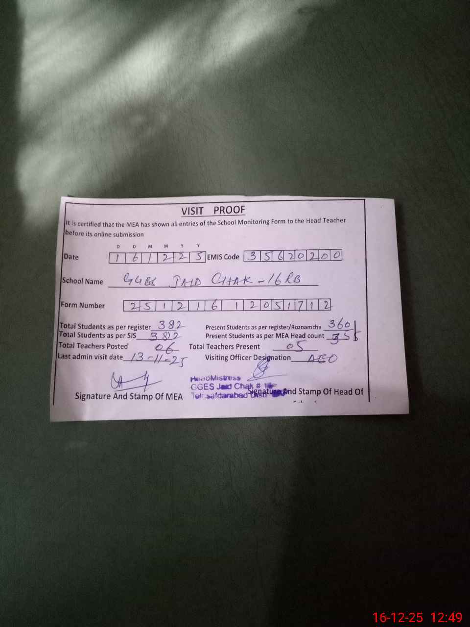 | EMIS Code: 35620200 | Name of School: GGES JAID CHAK NO. 16 | |||
