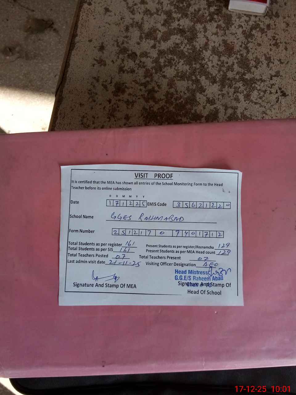 | Attendance Register | Head Teacher | MEA with School | Visit Proof |
