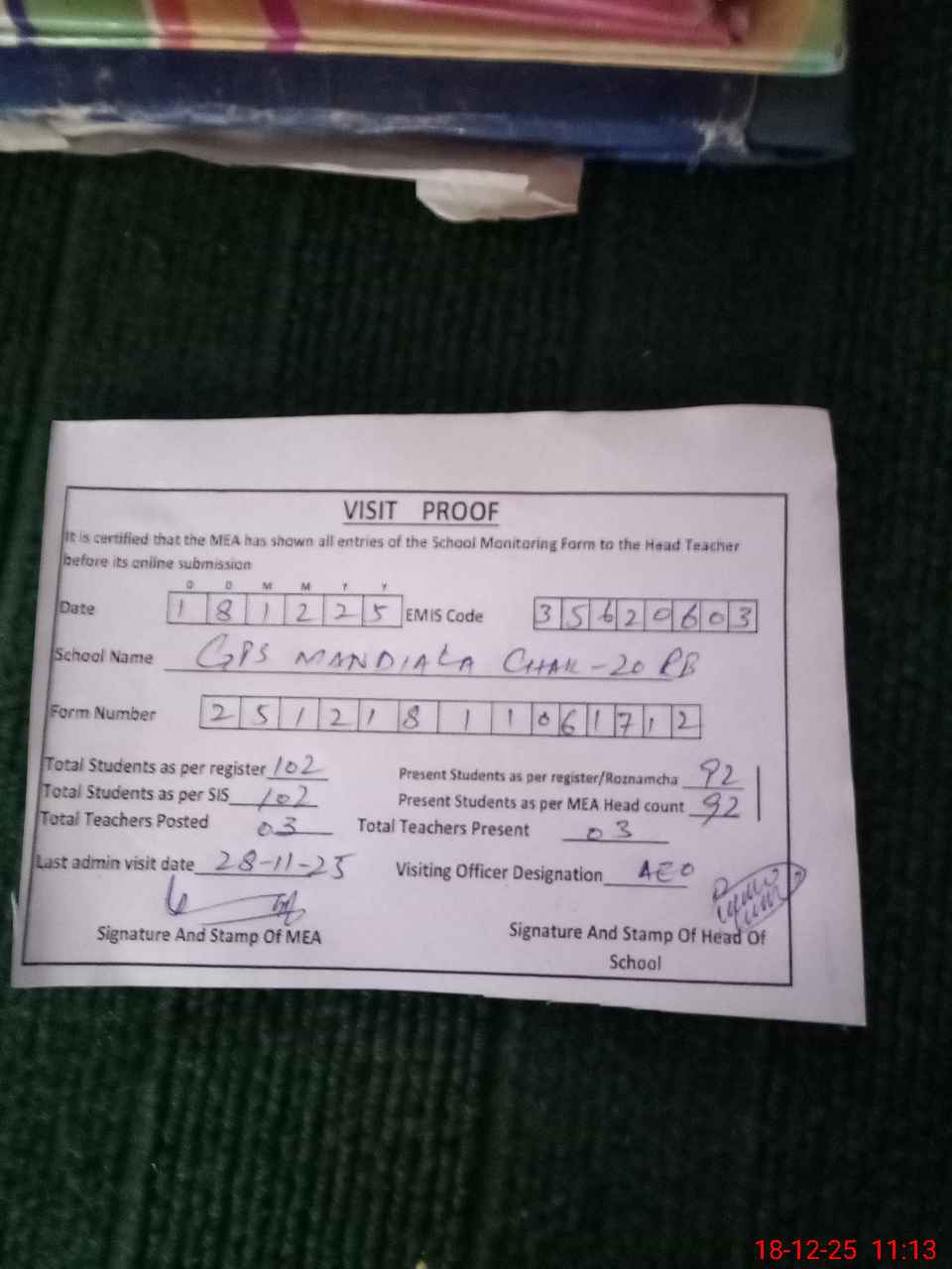 | EMIS Code: 35620603 | Name of School: GPS MANDIALA CHAK NO 20 RB | |||