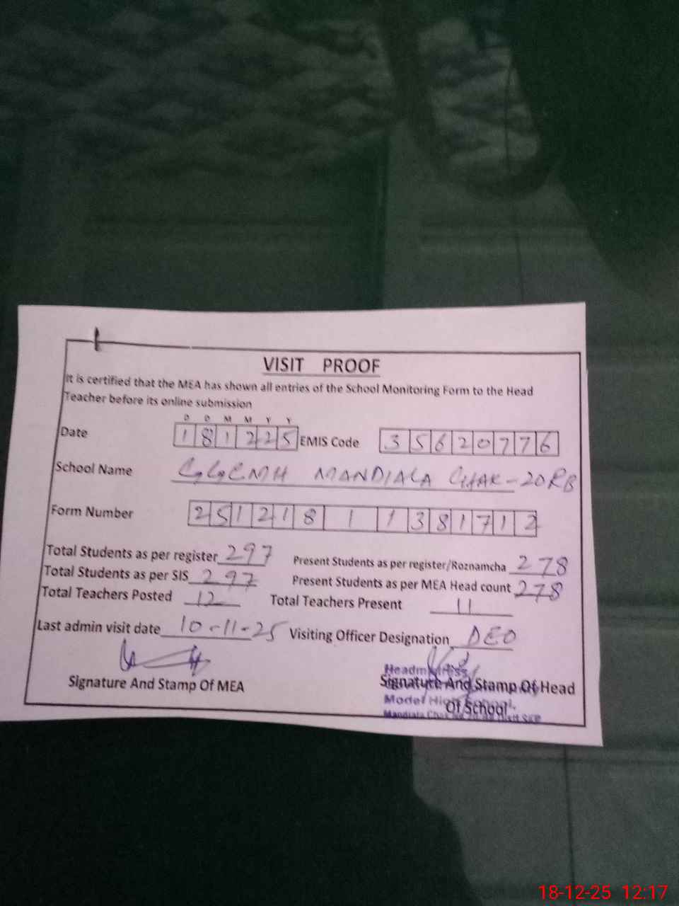 | Attendance Register | Head Teacher | MEA with School | Visit Proof |