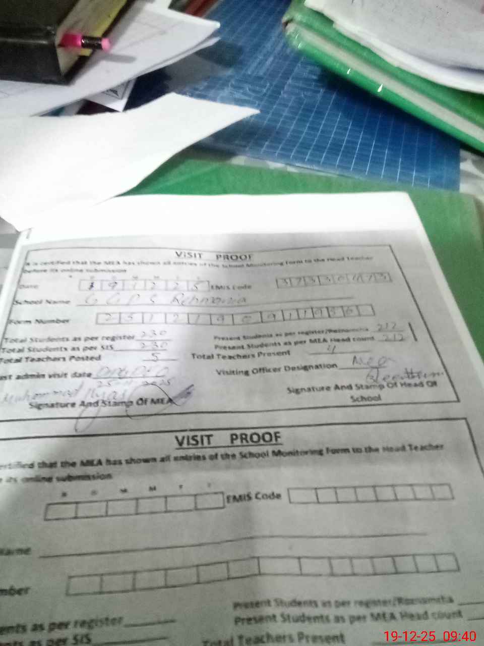 | Attendance Register | Head Teacher | MEA with School | Visit Proof |