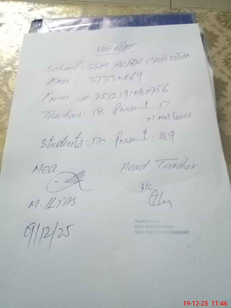 | Attendance Register | Head Teacher | MEA with School | Visit Proof |