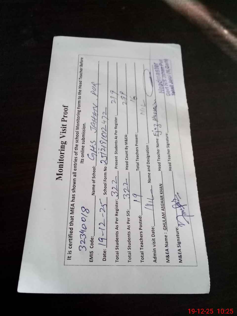 | Attendance Register | Head Teacher | MEA with School | Visit Proof |