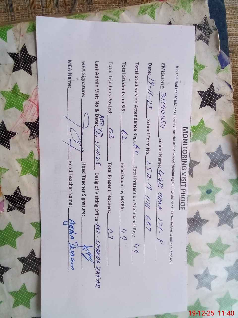 | Attendance Register | Head Teacher | MEA with School | Visit Proof |