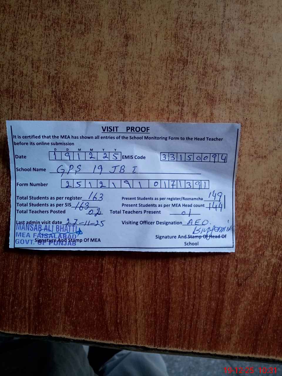 | Certified that this School was Inspected by the Undersigned MEA/DMO Today and the Information Stated Above is as Per Record. | |||||