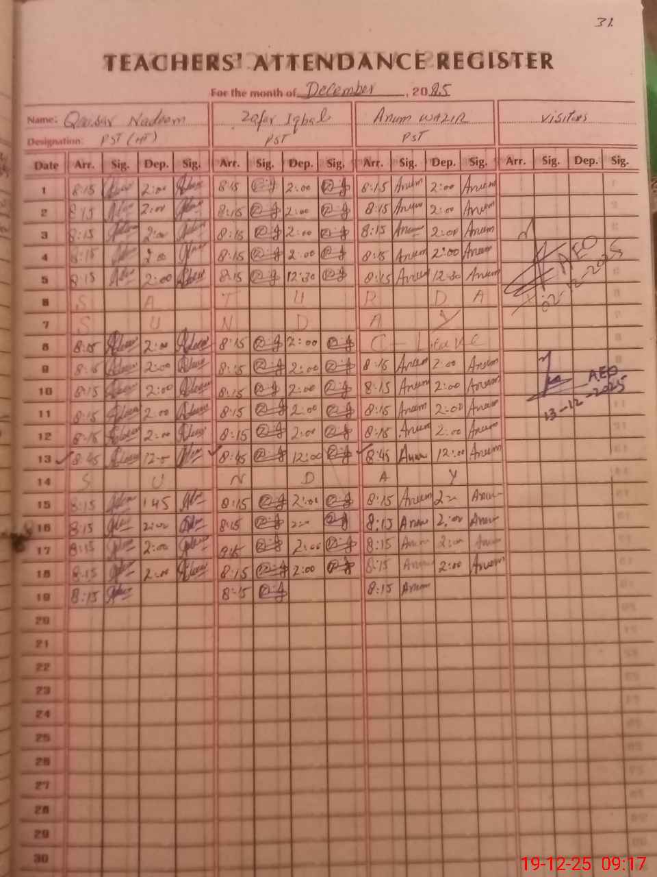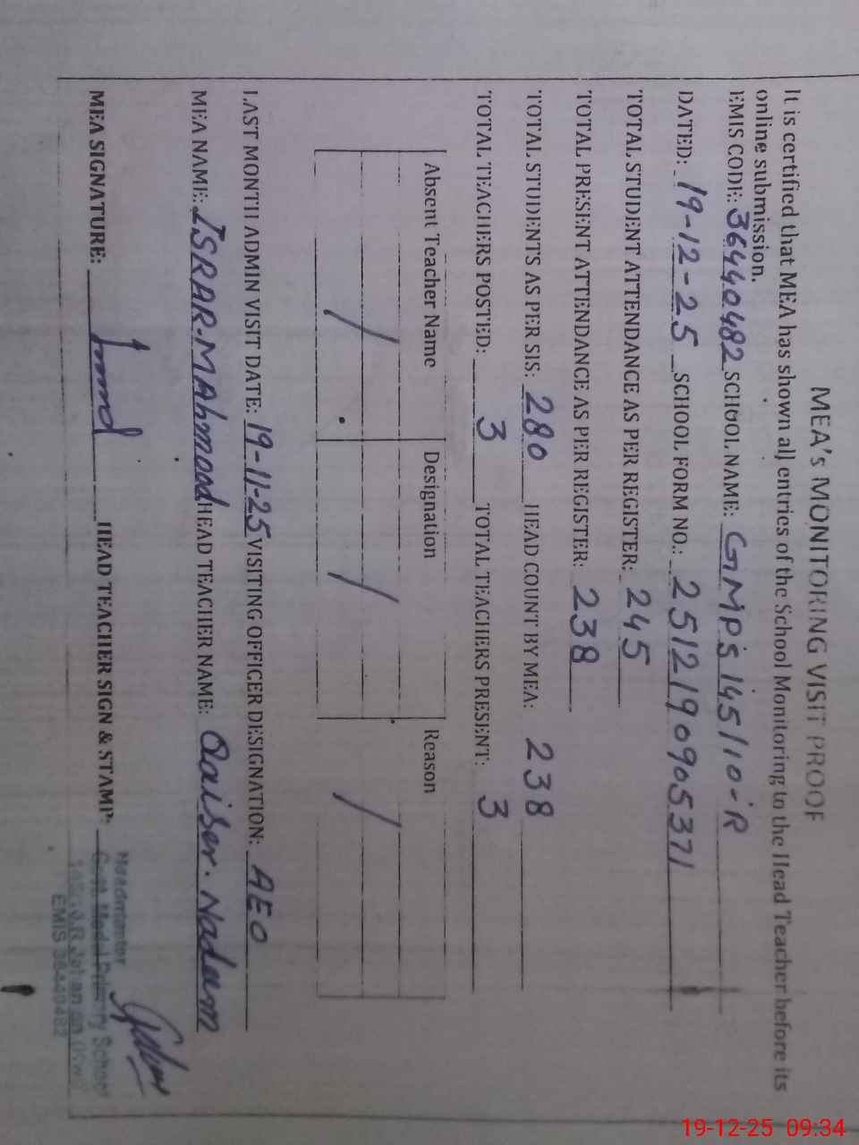 | Attendance Register | Head Teacher | MEA with School | Visit Proof |