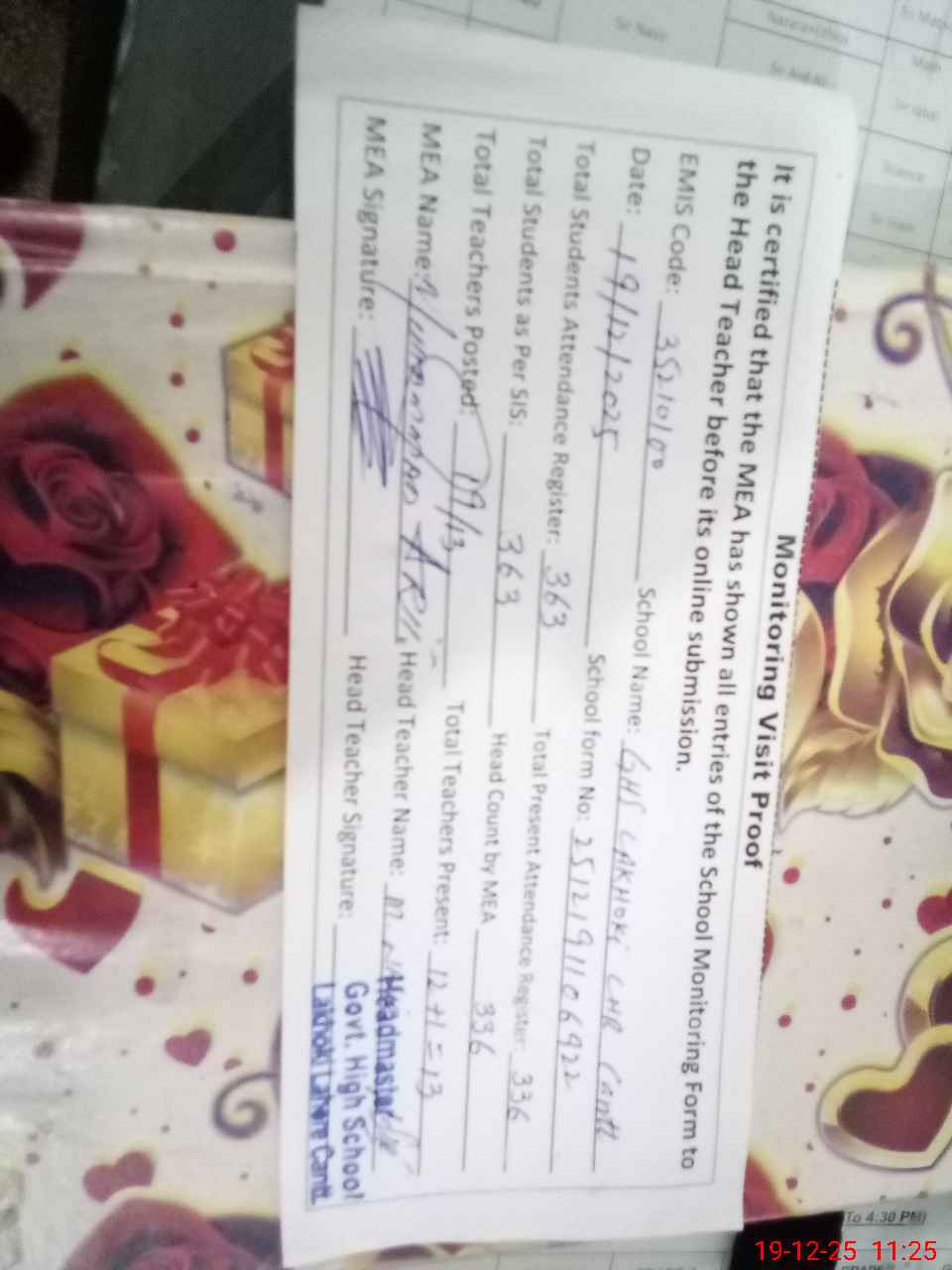 | Certified that this School was Inspected by the Undersigned MEA/DMO Today and the Information Stated Above is as Per Record. | |||||