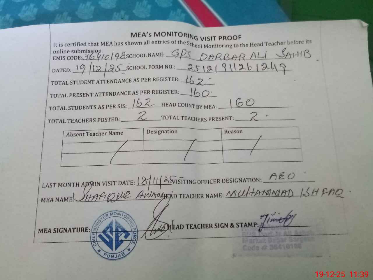 | EMIS Code: 36410198 | Name of School: GPS DARBAR ALI ASHAB, P/O MOUZA JAHAN PUR, KABIRWALA | |||