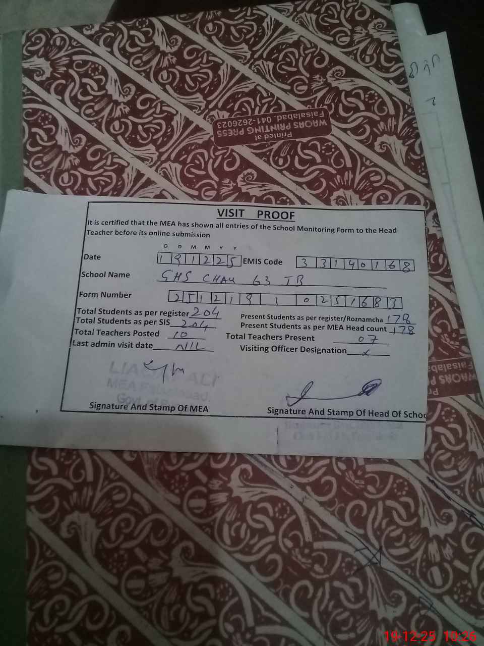 | Certified that this School was Inspected by the Undersigned MEA/DMO Today and the Information Stated Above is as Per Record. | |||||