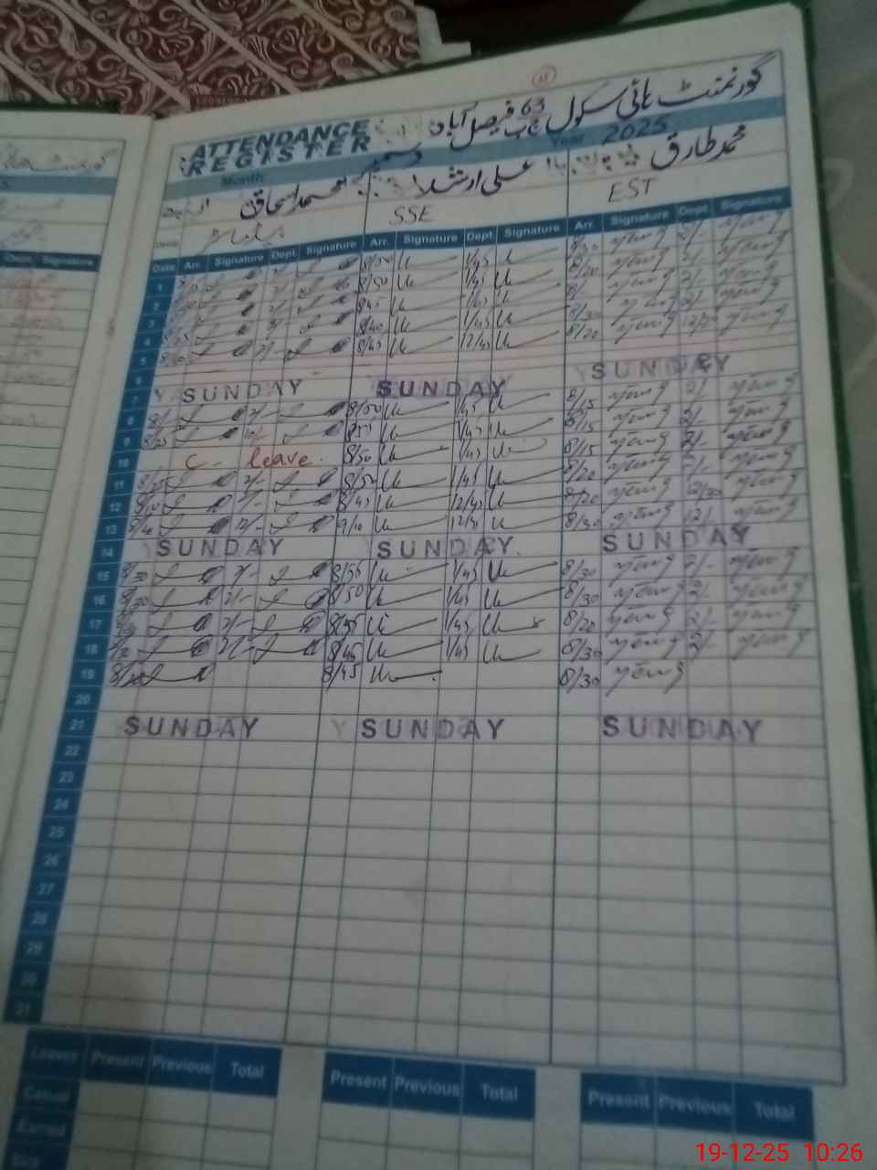 | Remarks (Use Separate Page if Required): SSE Ali Arshad arrived on duty at 1000 hrs so marked him unauthorized Chokidar Mohsin Abbas attached with New Madrassa high school GM Abad wef 6 -10-2025 to 26-12-2025 | |||||