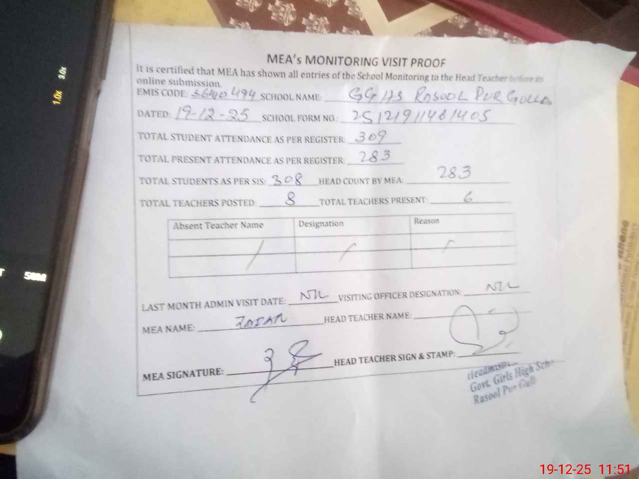 | Attendance Register | Head Teacher | MEA with School | Visit Proof |