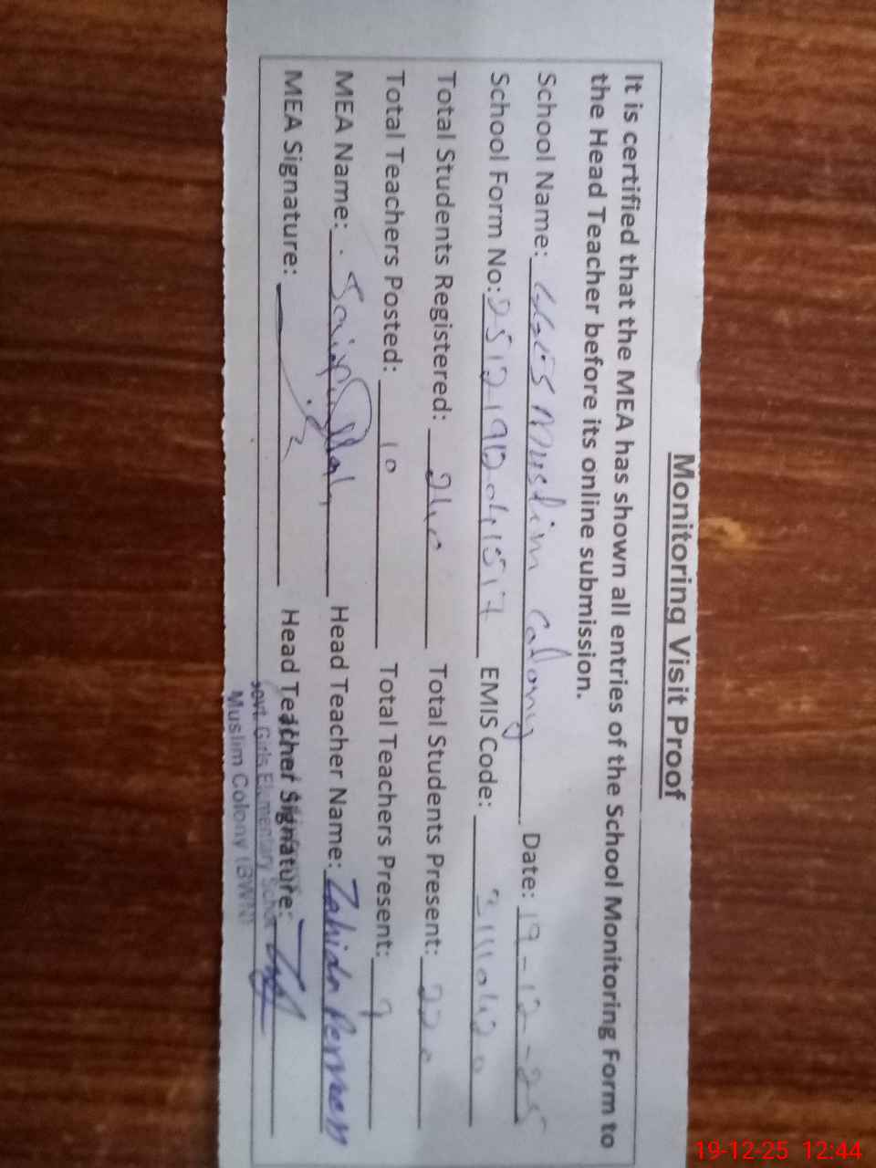 | Attendance Register | Head Teacher | MEA with School | Visit Proof |
