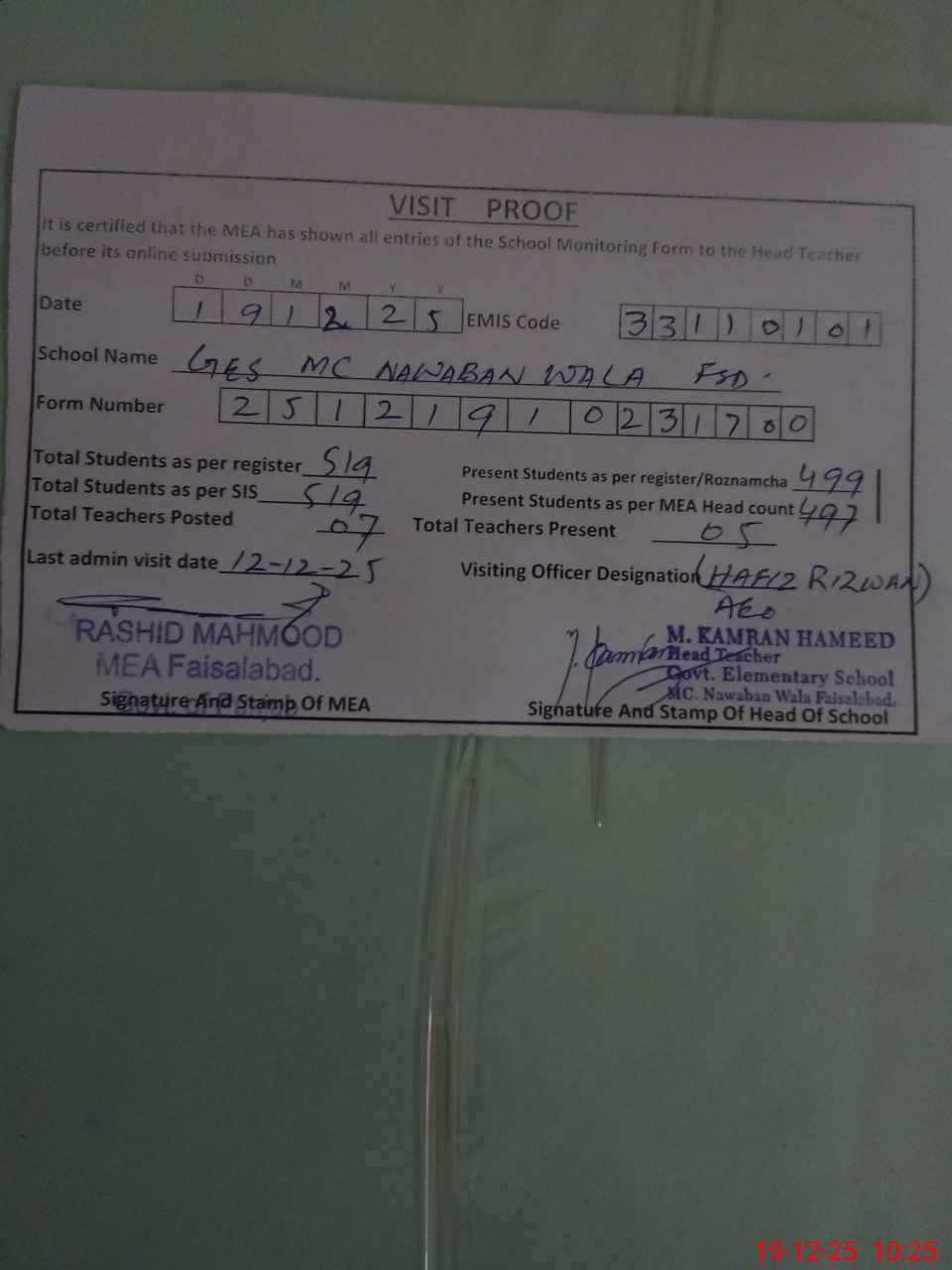 | EMIS Code: 33110101 | Name of School: GES MC NAWABAN WALA FSD | |||