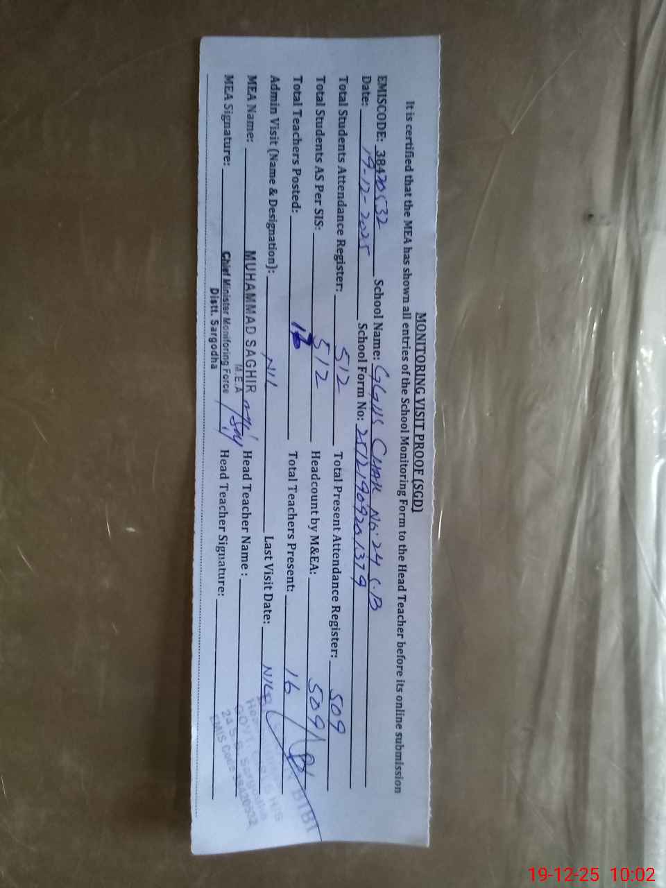 | Attendance Register | Head Teacher | MEA with School | Visit Proof |