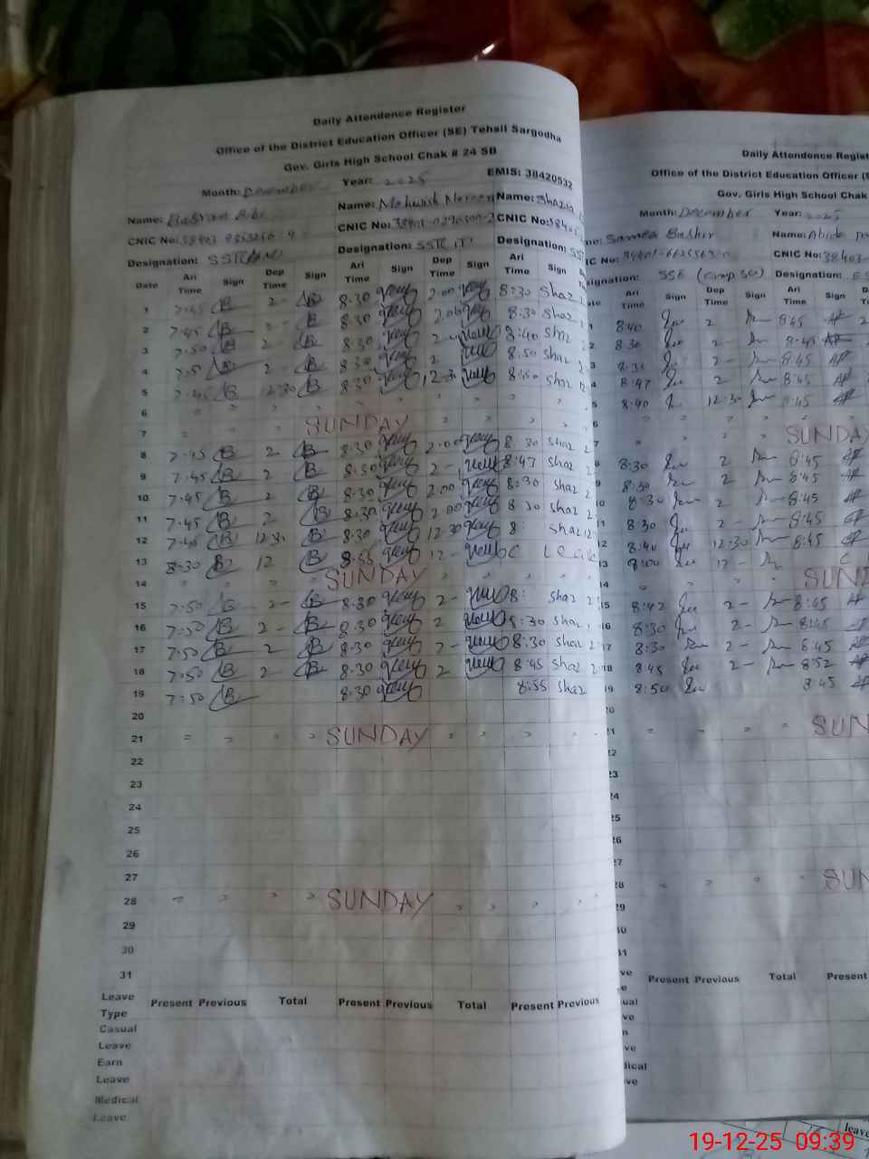 | CNIC | Full Name | Designation | R/C | Absence during last cal. month |