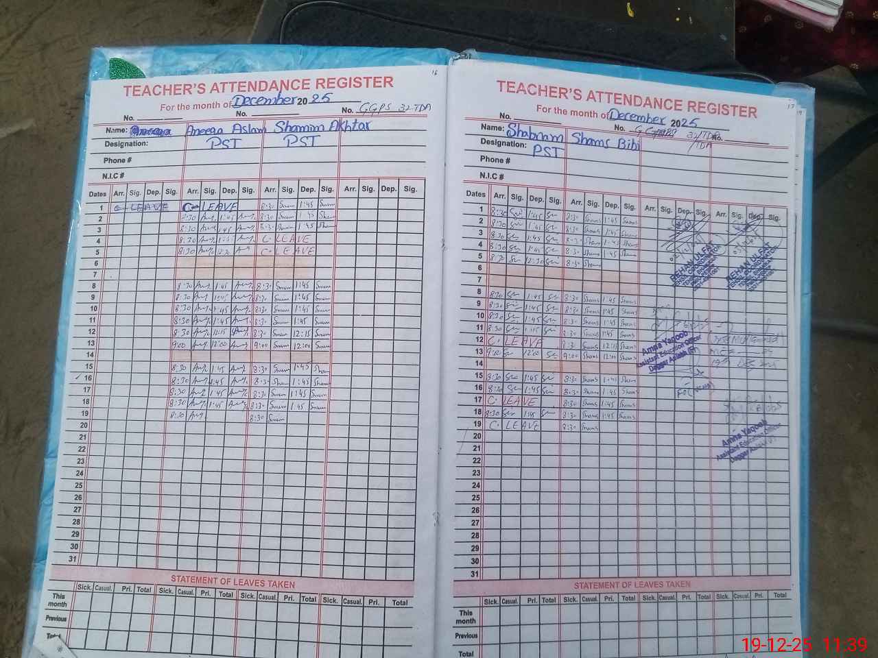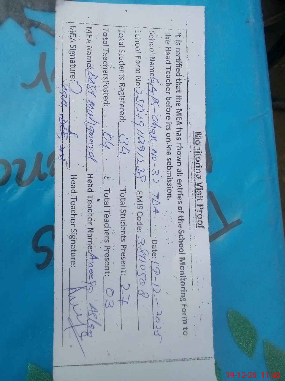 | Remarks (Use Separate Page if Required): All the entered data loudly share with the head teacher before submitting Last visited the subject school by educational authority Aamna Yaqoob AEO Dated 27th November 2025 | |||||