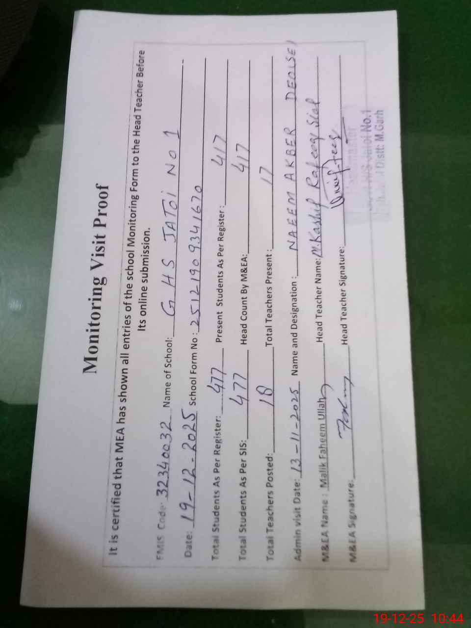 | Attendance Register | Head Teacher | MEA with School | Visit Proof |