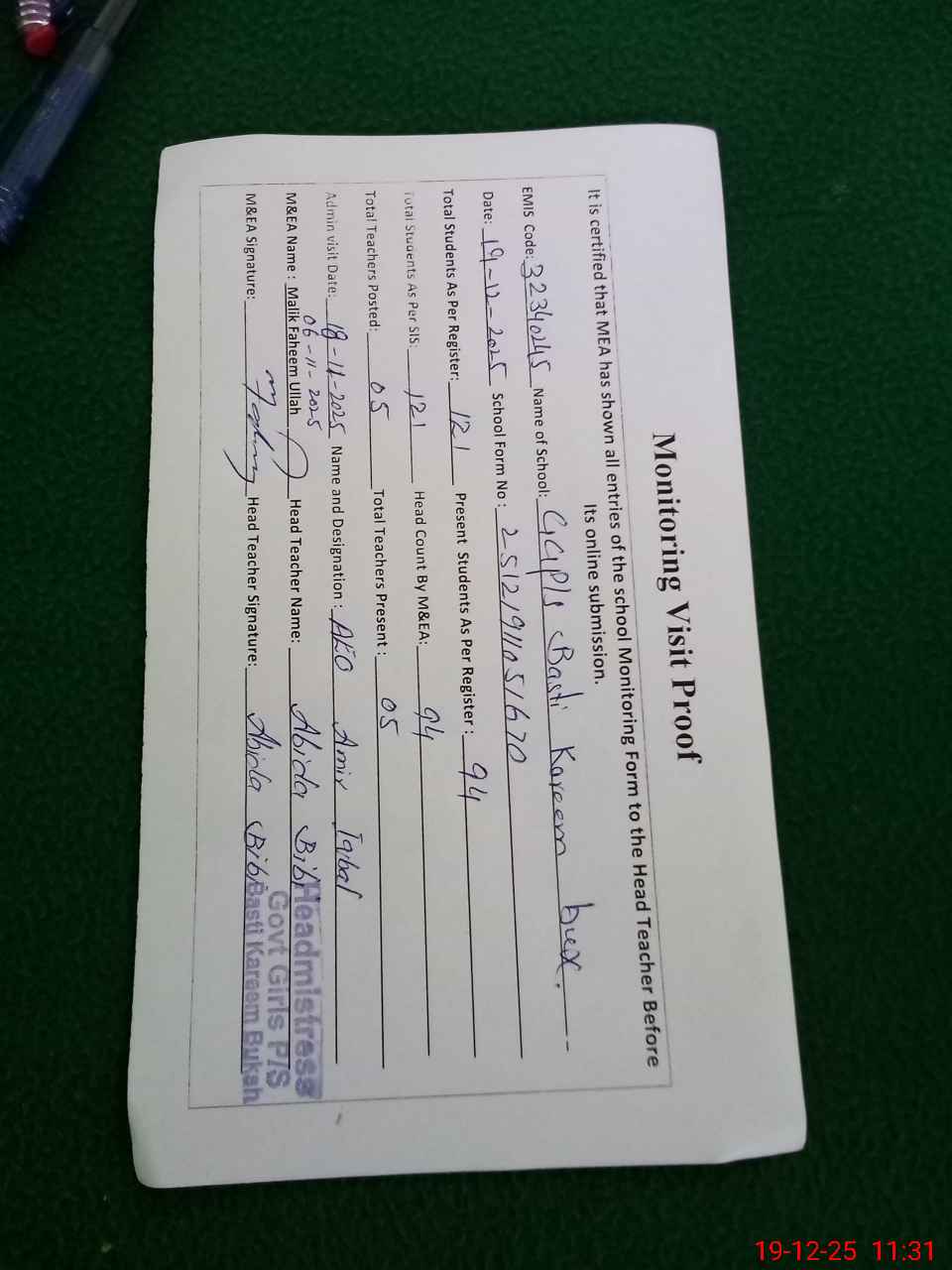 | Attendance Register | Head Teacher | MEA with School | Visit Proof |