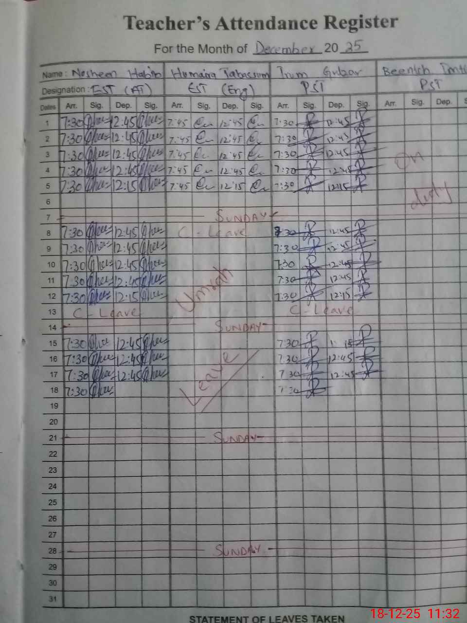 | Leave | Duty | Absent | Maternity | Medical | Ex- Pak |