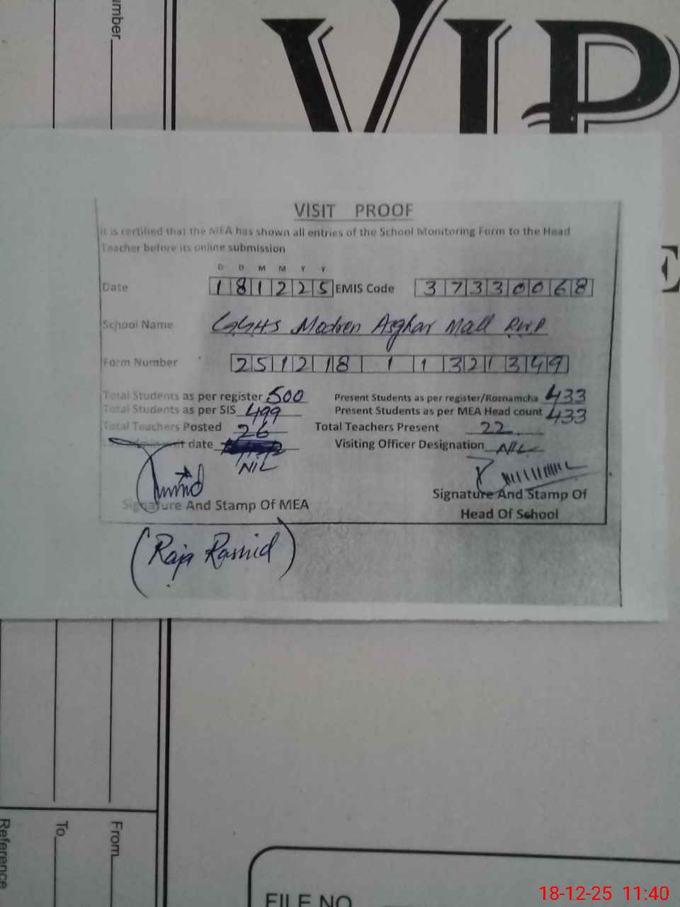 | Attendance Register | Head Teacher | MEA with School | Visit Proof |