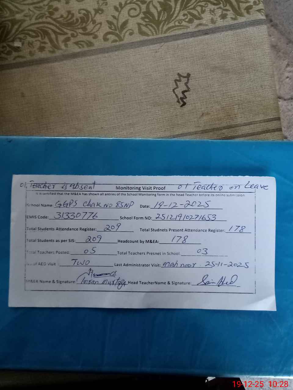 | Attendance Register | Head Teacher | MEA with School | Visit Proof |