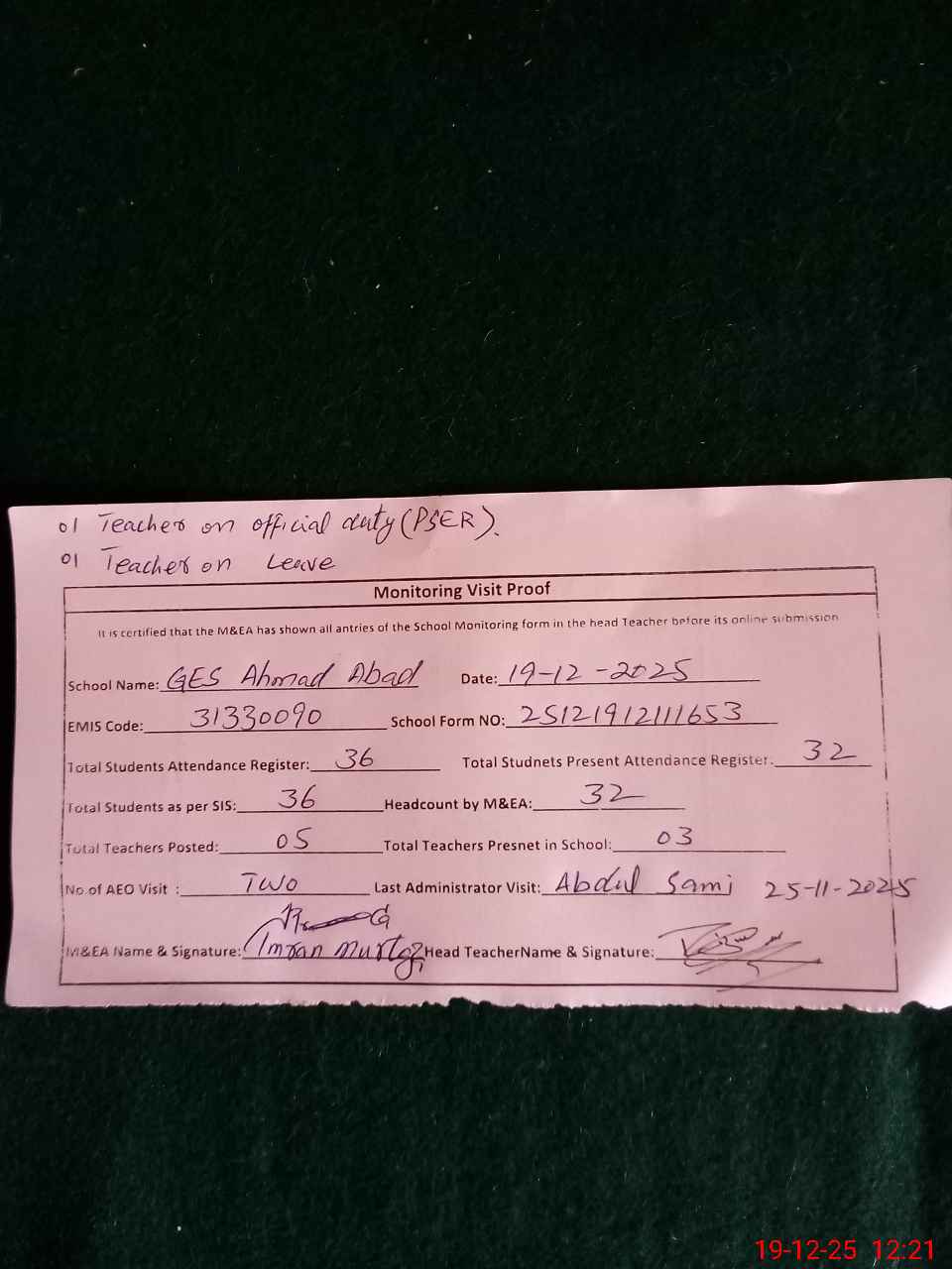 | Attendance Register | Head Teacher | MEA with School | Visit Proof |