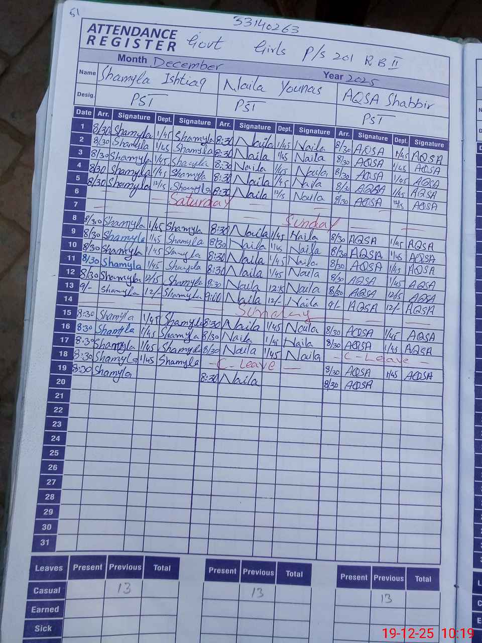 | 33**** | Sh**** Qa**** | PST Arts | Regular | 0 | 0 | 0 | 0 | 0 | 0 | 0 | 0 | 0 | Casual |